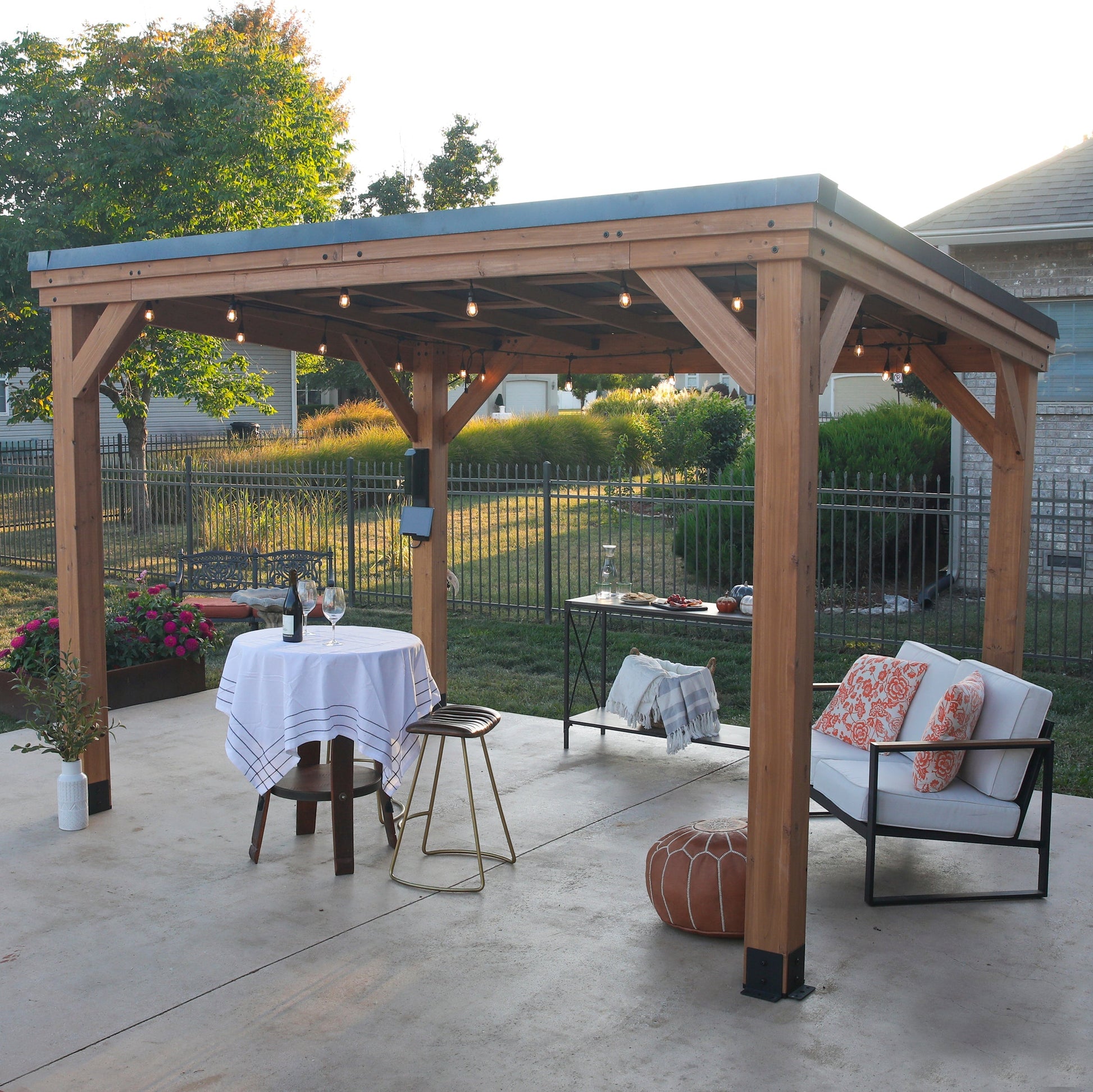 Elevate your outdoor living space with the inviting Arcadia Gazebo by Backyard Discovery. Whether you're hosting weekend brunches, enjoying peaceful relaxation, or entertaining guests, its versatility creates the perfect setting for any occasion. This charming wooden gazebo seamlessly enhances your backyard style, featuring sleek clean lines and a durable, sloped galvanized steel roof that prevents water accumulation while protecting against corrosion. Built to endure the elements, this outdoor gazebo is Pro-Tect™ tested and proven to withstand a roof load of up to 5,800 pounds and wind speeds up to 100 mph*, ensuring reliable stability in any weather conditions. Elegantly crafted from cedar wood, this backyard gazebo enhances your outdoor space with rustic charm and is naturally resistant to rot and decay, promising a long-lasting addition to your home. Easily charge your devices, add cozy lighting, and enjoy your favorite tunes using our exclusive PowerPort™, featuring three electrical outlets and USB ports to create the perfect ambiance. There’s plenty of room for seating and decor while maintaining an open, airy feel. Its ready-to-assemble design features pre-cut, pre-drilled, and pre-stained pieces, making constructing your patio gazebo kit a breeze. Create your perfect outdoor retreat with the Arcadia Gazebo—where functionality meets timeless design. Now available with enhanced quality and crafted for lasting performance.