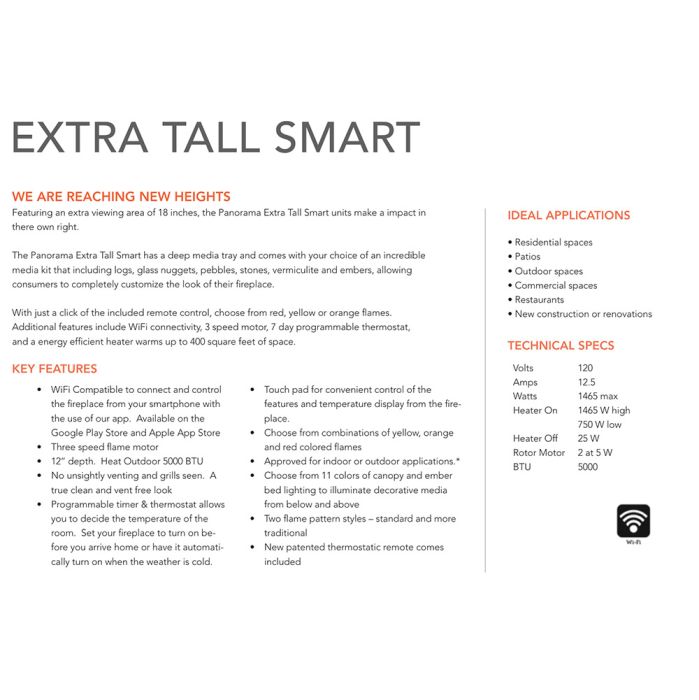 Amantii Panorama Deep Extra Tall Indoor/Outdoor Built-In Smart Electric Fireplace Upgrade your space with the Amantii Panorama Deep & Xtra Tall Full View Smart Electric Fireplace. This fireplace offers a luxurious heating alternative to traditional wood or gas fireplaces, providing an instant upgrade for any room. Its outdoor-compatible design allows for flexible installation, while the adjustable ambient LED canopy lighting adds a captivating touch. With cutting-edge flame presentation and customizable colored lighting, you can create the perfect ambiance for any occasion. Plus, the integrated 5,000 BTU heater and included remote control make this fireplace an impressive package. And with WiFi-enabled Smart technology, you can easily control the fireplace from your smartphone. Enjoy the comfort and convenience of a fireplace without the hassle and cost with Amantii.