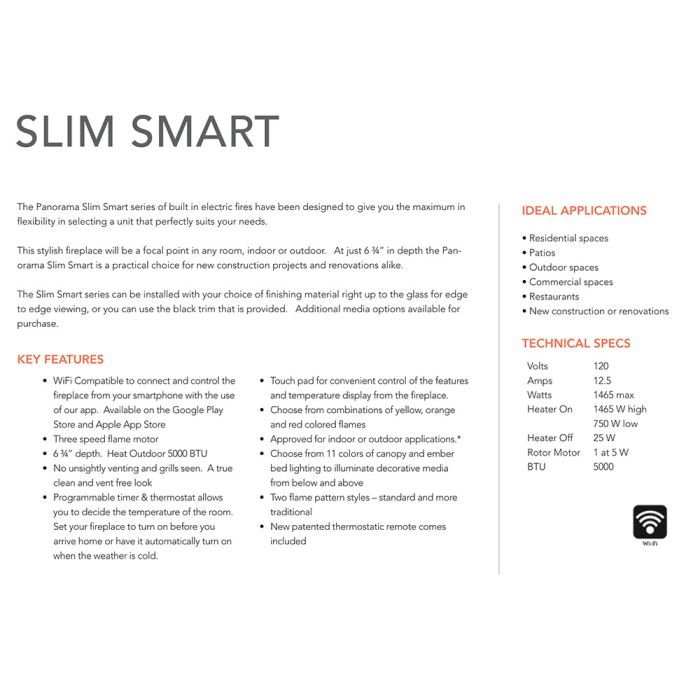 Amantii Panorama Slim Built-In Smart Electric Fireplace Experience the ultimate upgrade for your space with the Amantii Panorama Slim and Deep Full View Smart Electric Fireplace. Say goodbye to the hassles and costs of a traditional wood or gas fireplace, and say hello to a premium heating alternative. With ambient LED canopy lighting, cutting-edge flame presentation, and the option to customize colors effortlessly, this fireplace is not just functional but also adds a captivating touch to your room.