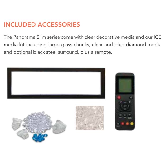 - Includes thermostatic remote control, clear fire glass, and ICE media kit