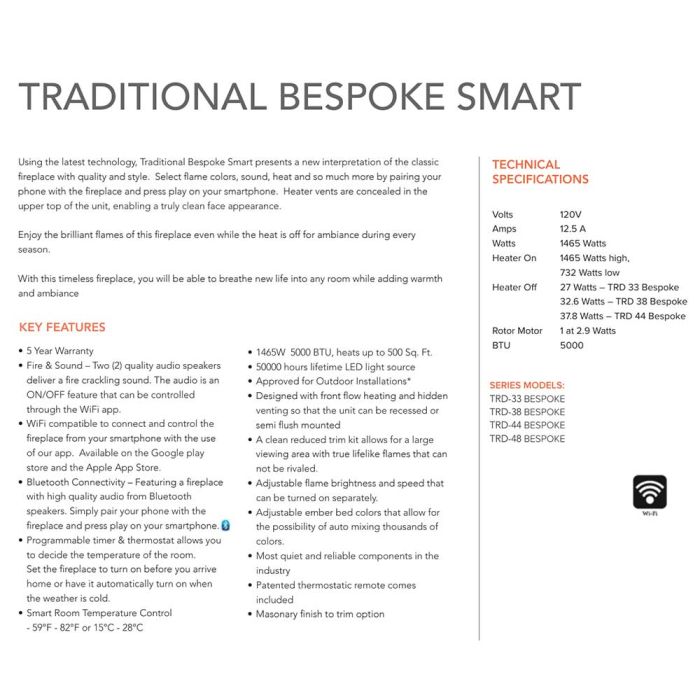 Amantii Traditional Bespoke Smart Electric Fireplace Experience the timeless elegance and exceptional quality of the TRD fireplace, available in multiple sizes to fit any room. The concealed heater and vents create a clean appearance, while the adjustable ember bed colors offer a variety of brilliant choices to suit your mood. Â Enjoy this fireplace's mesmerizing flames and ambiance year-round, indoors and outdoors. Upgrade your space with this bespoke electric fireplace/insert today!