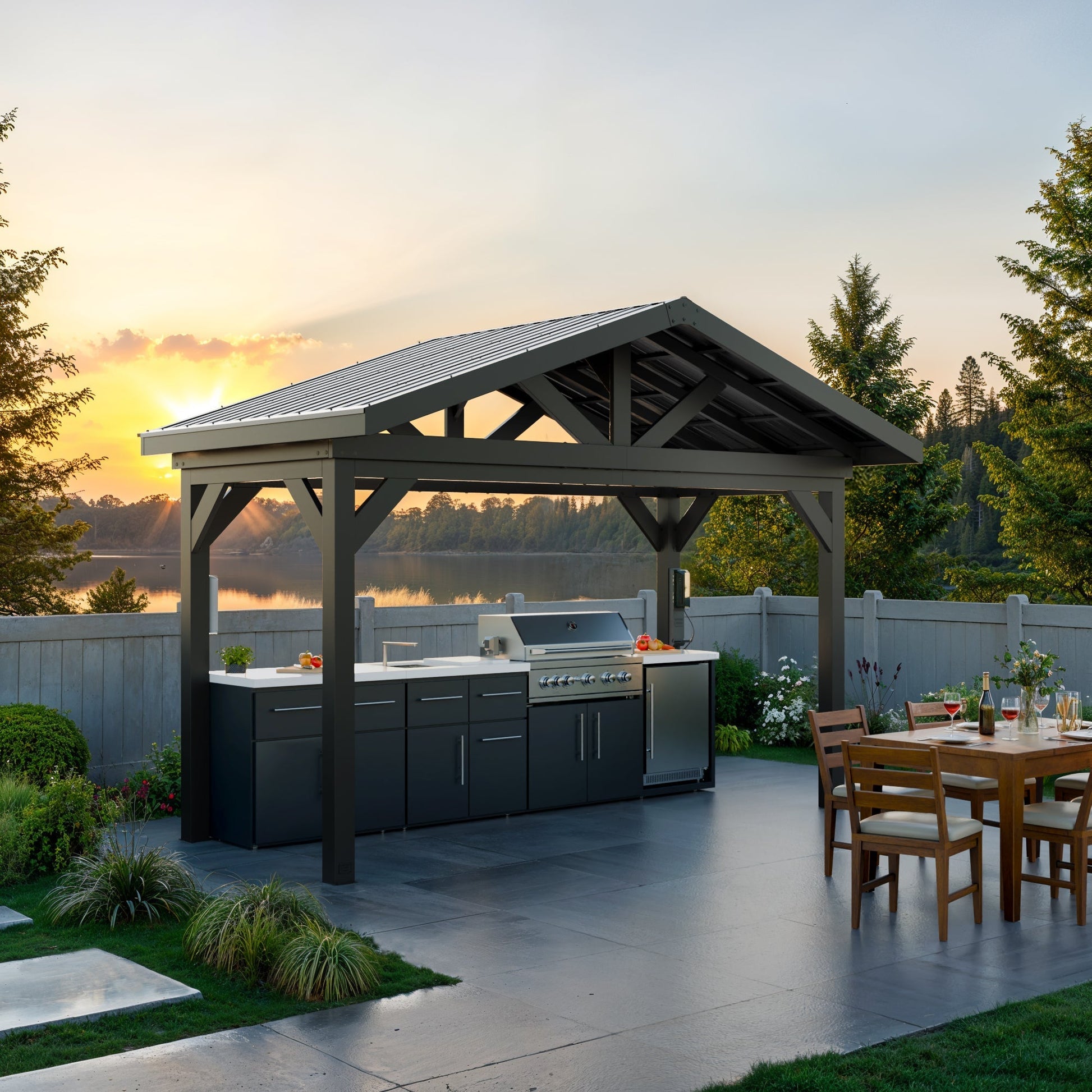 Upgrade your outdoor living with the all-weather Lancaster Linear Outdoor Kitchen from Backyard Discovery. Crafted from powder-coated galvanized steel with a full-coverage peak roof and simple linear cabinet design, this stylish kitchen allows you to enjoy outdoor cooking throughout every season while providing lasting protection against rust and corrosion. The premium stainless steel grill includes heavy-duty grates, a warming rack, flame tamers, searing burner, and infrared rotisserie for the perfect BBQ. Keep beverages perfectly chilled with the outdoor-rated refrigerator, featuring LED lighting and spacious three-layer storage. The elegant white marble countertop provides a generous food prep area, plus a built-in stowaway sink with a removable marble cover for even more usable space. Integrated soft-close cabinets and drawers offer plenty of storage to conveniently organize all your grill accessories and utensils, while the discreet pull-out trash bin makes cleanup a breeze and maintains a sophisticated look. Pro-Tect™ tested and proven to withstand up to 5,500 pounds of roof weight and 100 mph wind speeds*, the Lancaster delivers lasting durability. Plus, the PowerPort™ features three electrical outlets and USB ports for seamless outdoor entertaining. With a ready-to-assemble design and guided instructions through the BILT® app, you'll be cooking outdoors in no time. Now available with enhanced quality and crafted for lasting performance.